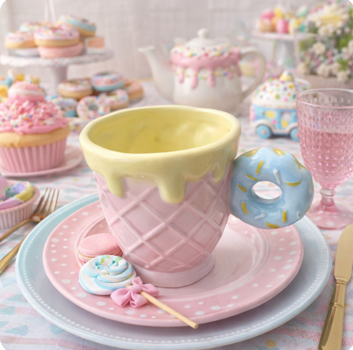 Caneca exclusiva em cerâmica com design de casquinha de sorvete rosa e cobertura na cor amarelo possui alça diferenciada em formato rosquinha, proporcionando um visual fofo e moderno. Ideal para presentear ou para uso diário.
